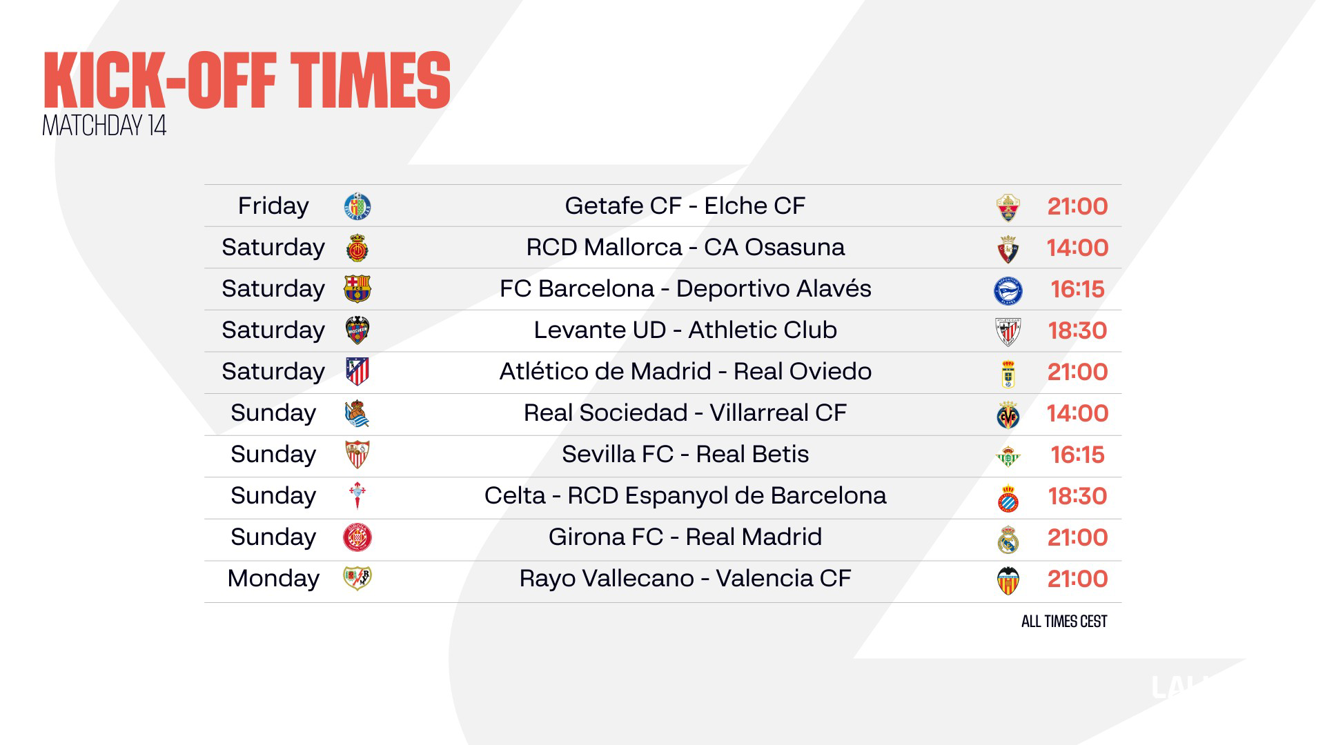 Matchday 14 of LALIGA EA SPORTS promises to be a fascinating one, with several intriguing fixtures on the schedule. One of those is ELGRAN DERBI between Sevilla FC and Real Betis, while FC Barcelona and Real Madrid both play in Catalonia as the title race heats up.