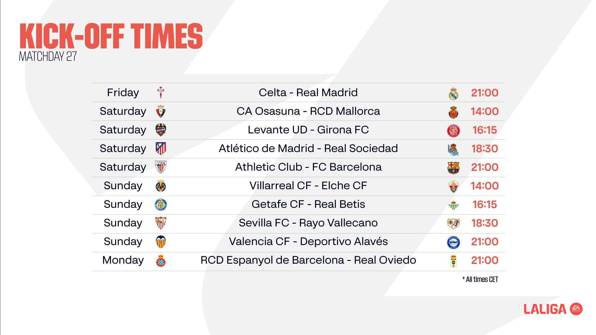Athletic Club and FC Barcelona, meanwhile, were the two defeated semi-finalists in midweek. They’ll each look to bounce back when they face off in Bilbao on Saturday night, with the three points on offer proving extra valuable now for both these teams.
